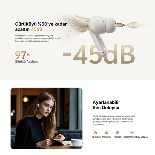 45 dB Adaptif Aktif Gürültü Engelleme (ANC): Çevresel gürültüyü %97'ye kadar azaltarak daha net bir dinleme deneyimi sunar.