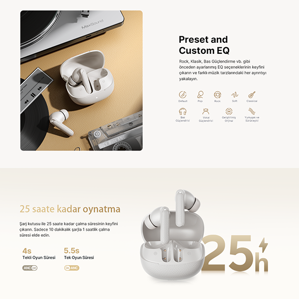 25 Saat Toplam Pil Ömrü & Hızlı Şarj: ANC kapalıyken tek şarjla 5,5 saat, açıkken 4 saat kullanım; 10 dakikalık şarjla 1 saat müzik dinleme imkanı sunar.