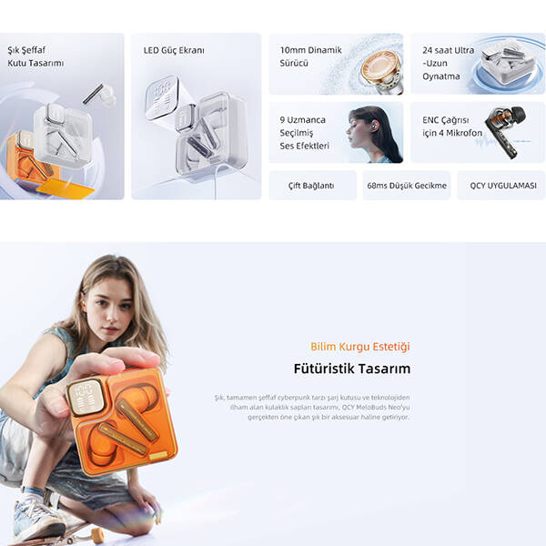 Fütüristik Şeffaf Tasarım ve LED Güç Göstergesi: Tamamen şeffaf şarj kutusu ve teknoloji esintili kulaklık gövdesi, modern cyberpunk tarzını yansıtır. Dahili dijital LED ekran sayesinde pil seviyelerini anlık olarak görebilirsiniz.